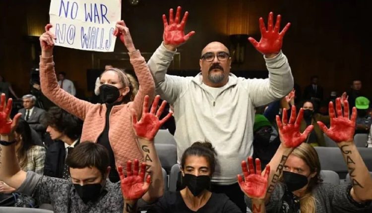 بلنکن کی بات شروع ہوتے ہی مظاہرین نے غزہ پر حملوں کے خلاف نعرے لگائے،کئی مظاہرین نے فلسطینیوں کے خون کی علامت کے طور پر ہاتھوں پر سُرخ رنگ بھی لگا رکھا تھا۔ نعروں کی وجہ سے سینیٹ کمیٹی کی کارروائی کئی مرتبہ روکنا پڑی۔
