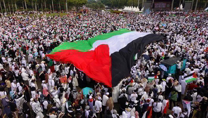 فلسطینیوں سے یکجہتی کے لیے انڈونیشیا کے دارالحکومت جکارتہ میں مظاہرین کا سمندر امڈ آیا۔