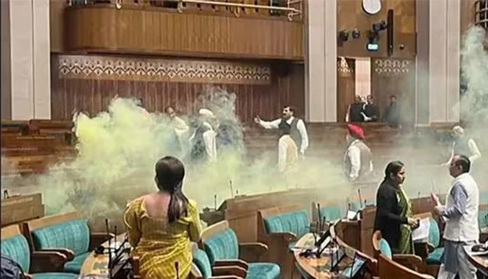 نوجوانوں نے اجلاس کے دوران ارکان کی نشستوں کی طرف کود کر اسموک بم پھینکے جس کے بعد ایوان میں افراتفری مچ گئی۔