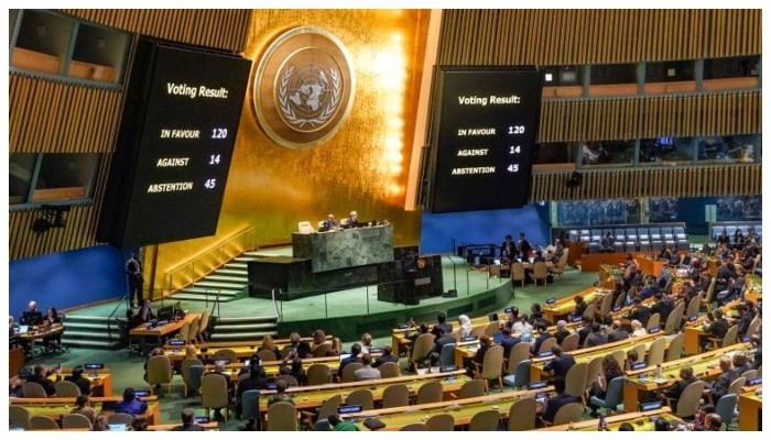 نیویارک: اقوام متحدہ کی جنرل اسمبلی میں فلسطین کو مکمل آزاد و خودمختار ریاست کا درجہ کل دیے جانے کا امکان ہے۔