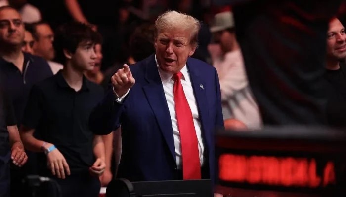 اس ویڈیو میں ڈونلڈ ٹرمپ نیو جرسی میں ہونے والی الٹی میٹ فائٹنگ چیمپئن شپ کی ایک فائٹ میں موجود ہیں۔