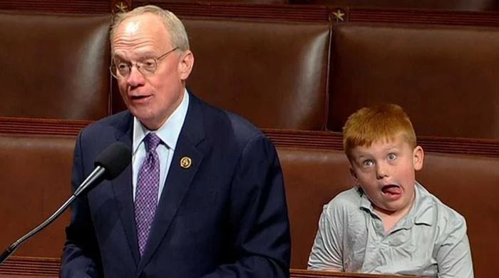 امریکی سیاستدان کے بیٹے کی ایوان نمائندگان میں والد کی تقریر کے دوران مضحکہ خیز حرکات کی ویڈیو وائرل ہوگئی۔