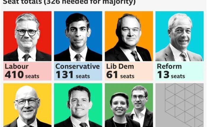 ایگزٹ پول کے مطابق لیبر پارٹی کو 410 اور کنزرویٹوپارٹی کو 131 نشستوں پر کامیابی کی توقع ہے جبکہ لب ڈیم کو 61 ، ریفارم کو 13، ایس این پی کو 10،گرین پارٹی کو 2 اور دیگر کو 23 نشستیں ملنے کا امکان ہے۔