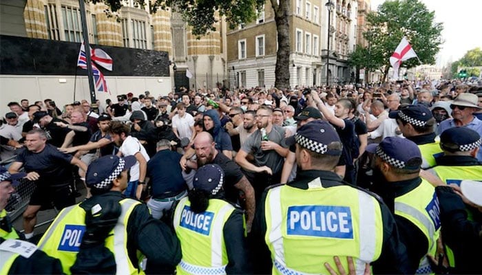 مظاہرین امیگرینٹس کیخلاف نعرے لگا رہے تھے جبکہ مسجد کے باہر کھڑے افراد کا کہنا تھا کہ برطانیہ میں نازی ازم برداشت نہیں کیا جائے گا۔