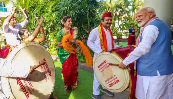 اس استقبال کے دوران مودی کے لیے ڈھول بھی بجایا گیا، ویڈیو میں دیکھا جاسکتا ہے کہ نریندر مودی ایک ڈھول بجانے والے کو روک کر خود ڈھول بجانا شروع کردیتے ہیں اور متاثر کن ڈھول بجاتے ہیں۔