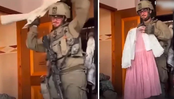 ویڈیو میں دیکھاجاسکتا ہے کہ سگریٹ منہ میں دبائے ایک اسرائیلی فوجی الماری سے لڑکیوں کی دو اسکرٹس اٹھائے ہوئے کھڑا ہے اور اپنے ساتھی فوجیوں سے رائے طلب کررہا ہے کہ کیا پہنوں؟