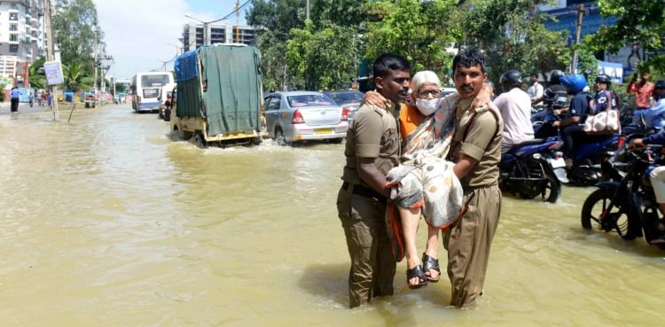 بھارتی میڈیا کے مطابق بھارتی ریاست بنگلورو میں طوفانی بارش سے نظامِ زندگی درھم برھم ہو گیا، عمارت گرنے کے نتیجے میں پانچ افراد ہلاک ہوگئے جبکہ سولہ افراد ملبے تلے دب گئے۔