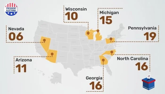 امریکی ریاستیں ایریزونا، جارجیا، مشی گن، نیواڈا، شمالی کیرولائنا، پینسلوینیا اور وسکونسن کا کردار صدارتی انتخابات میں اہم ہوگا، ڈیموکریٹ امیدوار کملا ہیرس اور ری پبلکن امیدوار ڈونلڈ ٹرمپ کے درمیان سخت مقابلہ ممکن ہے اور یہی ریاستیں فیصلہ کریں گی ملک کا اگلا صدر کون ہو گا۔